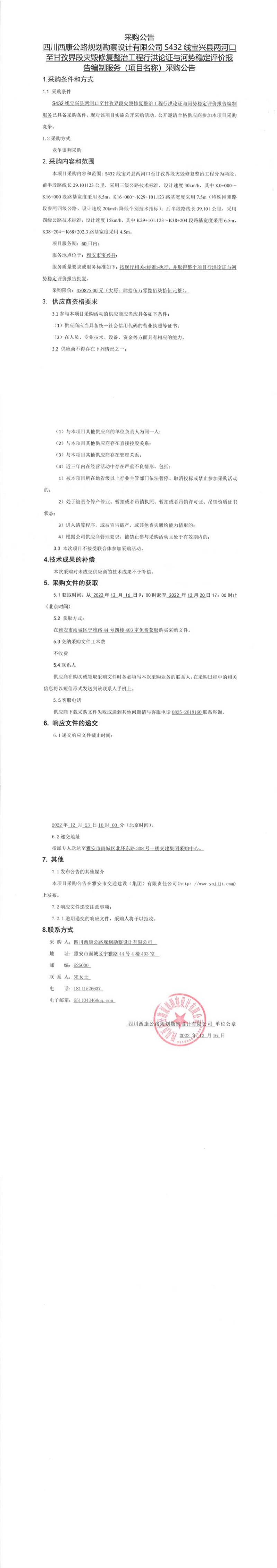 四川西康公路規(guī)劃勘察設(shè)計(jì)有限公司S432線寶興縣兩河口至甘孜界段災(zāi)毀修復(fù)整治工程行洪論證與河勢(shì)穩(wěn)定評(píng)價(jià)報(bào)告編制服務(wù)(項(xiàng)目名稱(chēng))采購(gòu)公告