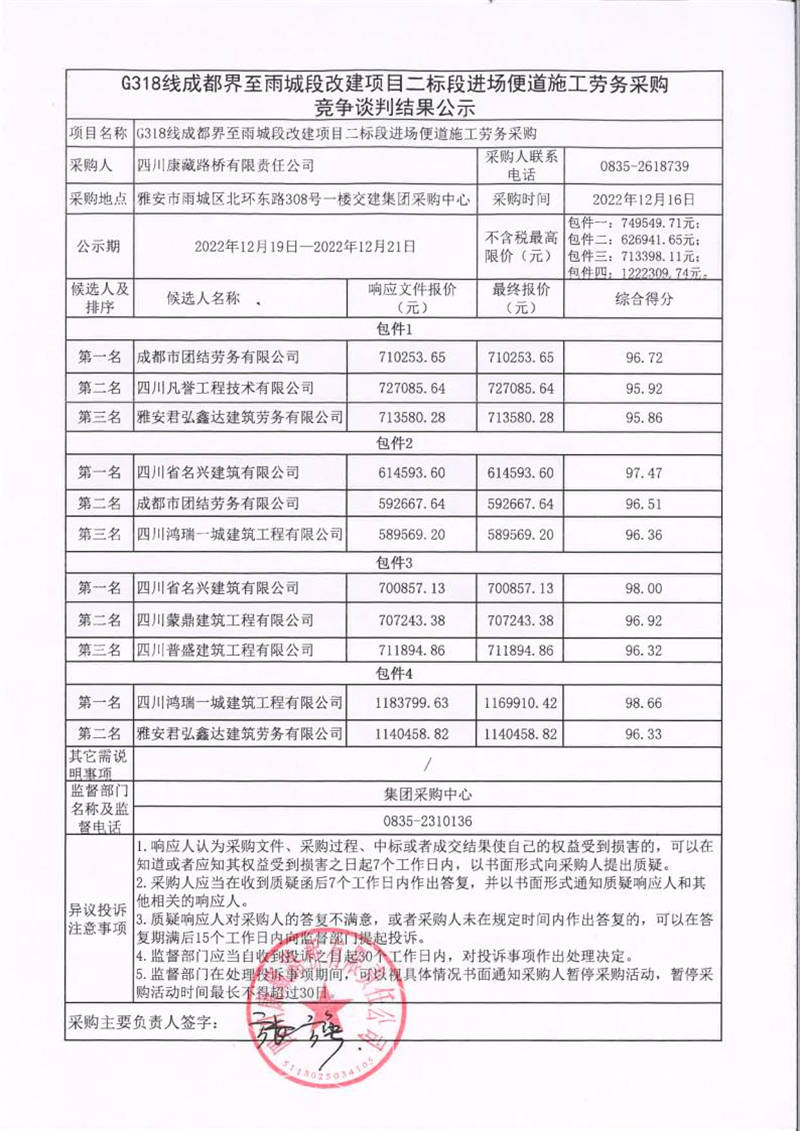 四川康藏路橋有限責(zé)任公司G318線成都界至雨城段改建項目二標(biāo)段進場便道施工勞務(wù)采購競爭談判結(jié)果公示
