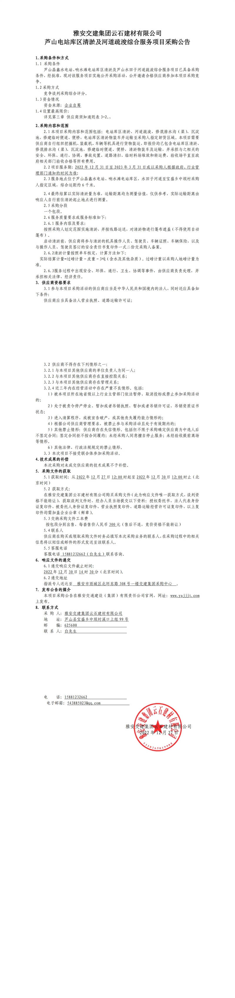 雅安交建集團(tuán)云石建材有限公司蘆山電站庫(kù)區(qū)清淤及河道疏浚綜合服務(wù)項(xiàng)目采購(gòu)公告