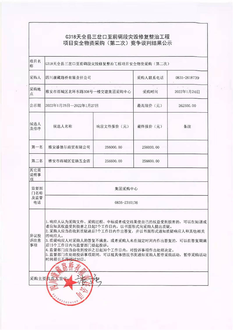 四川康藏路橋有限責(zé)任公司G318天全縣三岔口至前碉段災(zāi)毀修復(fù)整治工程項(xiàng)目安全物資采購(第二次)競(jìng)爭(zhēng)談判結(jié)果公示