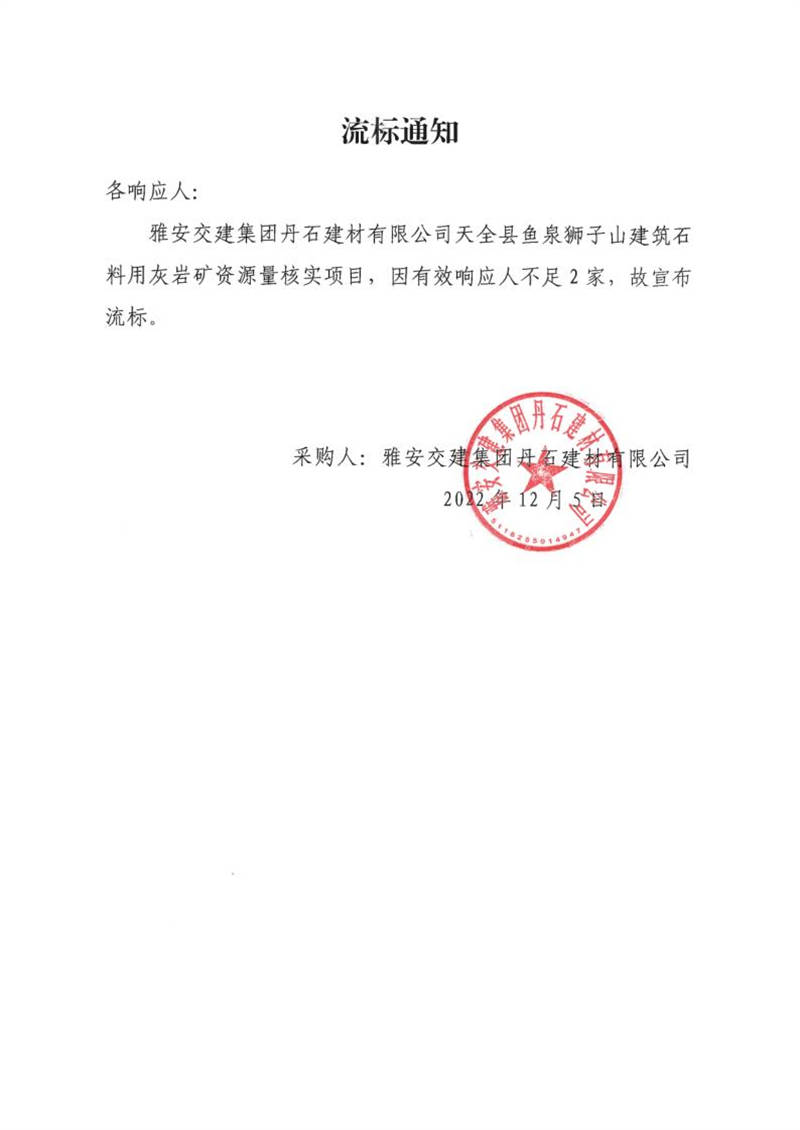 雅安交建集團丹石建材有限公司天全縣魚泉獅子山建筑石料用灰?guī)r礦資源量核實項目流標通知