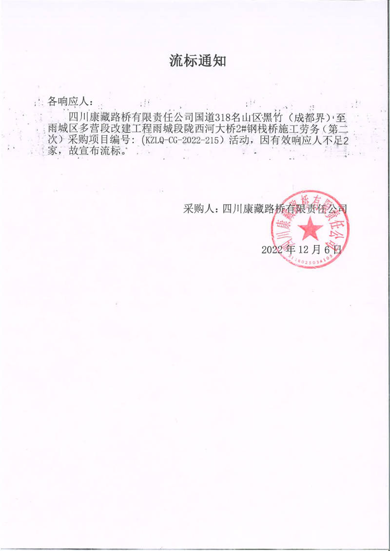四川康藏路橋有限責(zé)任公司國道318名山區(qū)黑竹(成都界)至雨城區(qū)多營段改建工程雨城段隴西河大橋2#鋼棧橋施工勞務(wù)(第二次)采購項(xiàng)目流標(biāo)通知