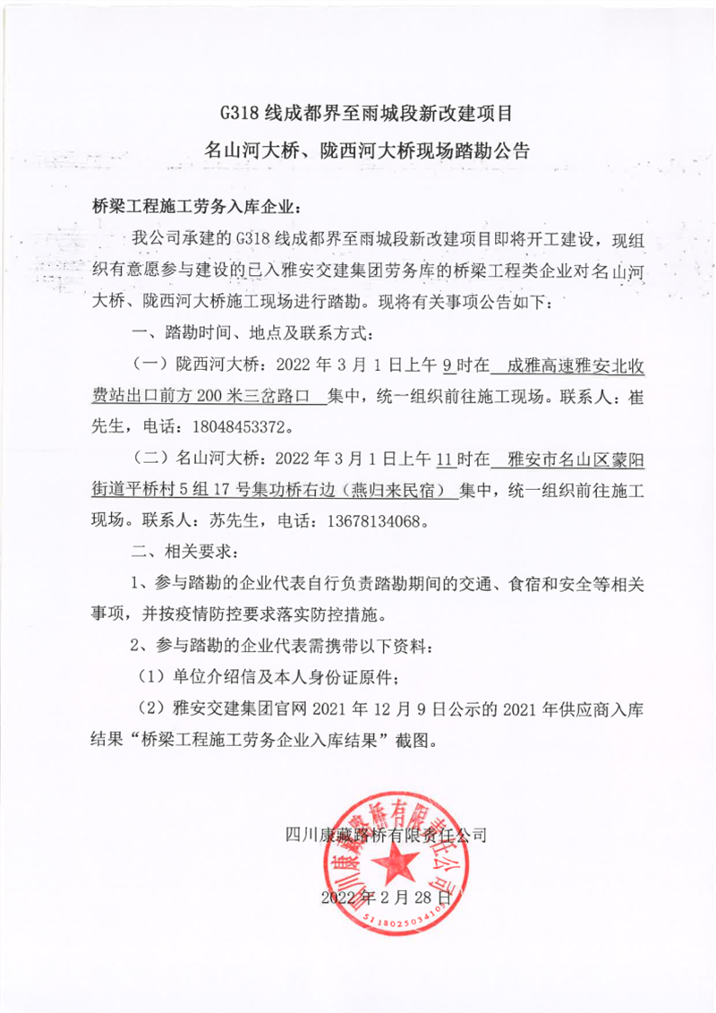 四川康藏路橋有限責(zé)任公司G318線成都界至雨城段新改建項(xiàng)目名山河大橋、隴西河大橋現(xiàn)場(chǎng)踏勘公告