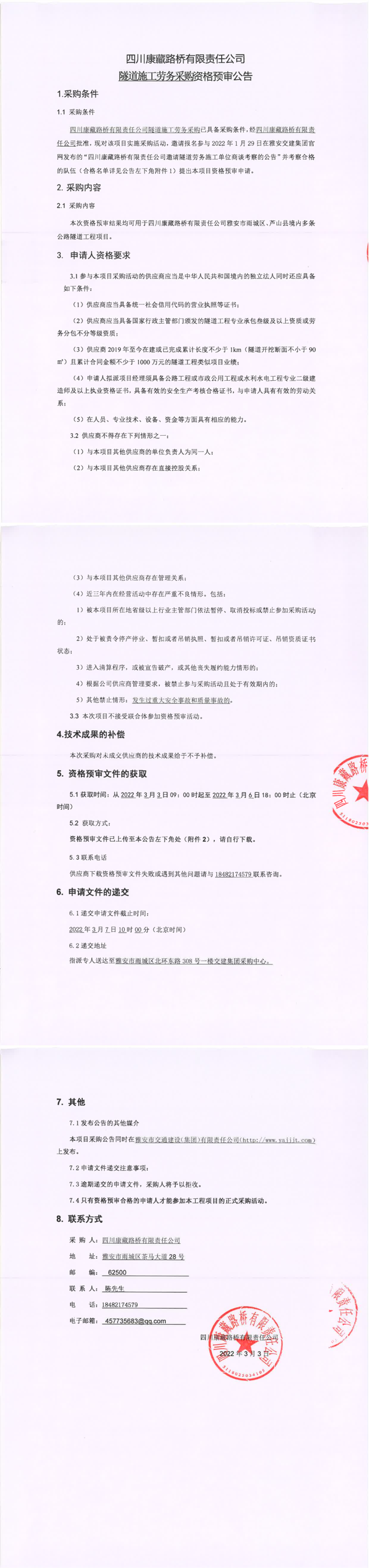 四川康藏路橋有限責任公司隧道施工勞務采購資格預審公告