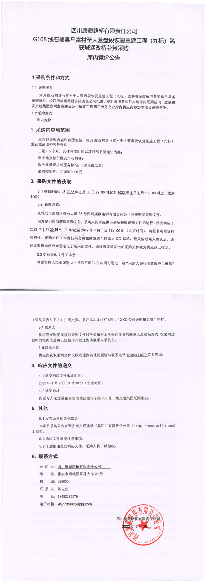 四川康藏路橋有限責(zé)任公司G108線(xiàn)石棉縣馬富村至大營(yíng)盤(pán)段恢復(fù)重建工程(九標(biāo))孟獲城涵改橋勞務(wù)采購(gòu)庫(kù)內(nèi)競(jìng)價(jià)公告