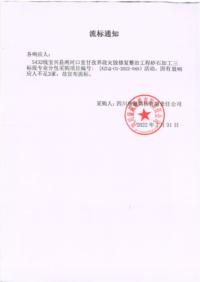 四川康藏路橋有限責(zé)任公司S432線寶興縣兩河口至甘孜界段災(zāi)毀修復(fù)整治工程砂石加工三標(biāo)段專(zhuān)業(yè)分包采購(gòu)項(xiàng)目流標(biāo)通知
