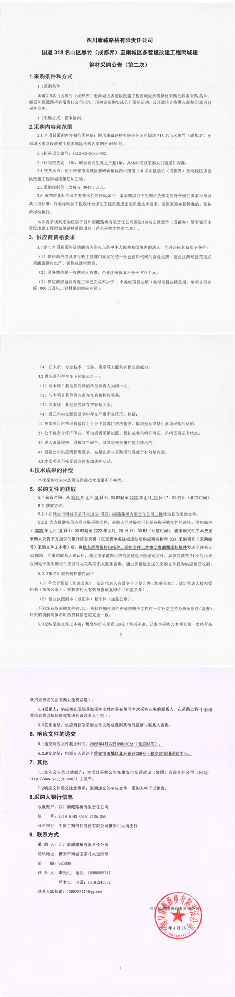 四川康藏路橋有限責任公司國道318名山區(qū)黑竹(成都界)至雨城區(qū)多營段改建工程雨城段鋼材采購公告(第二次)