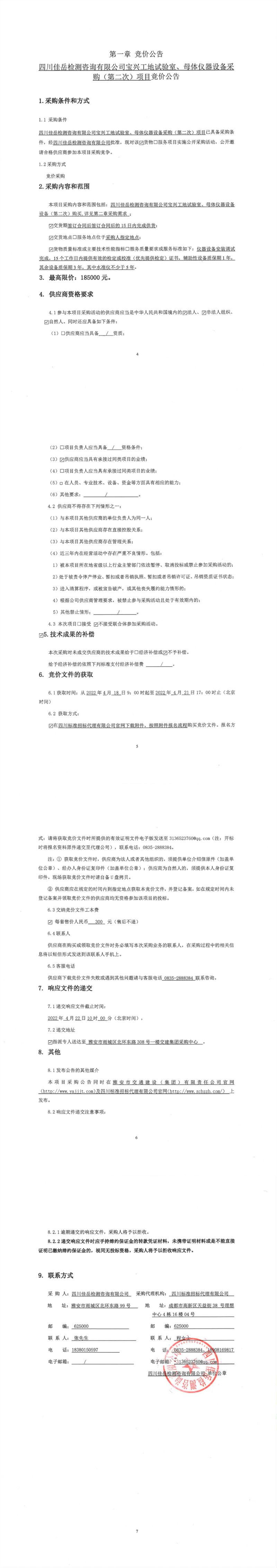 四川佳岳檢測咨詢有限公司寶興工地試驗室、母體儀器設(shè)備采購(第二次)項目競價公告