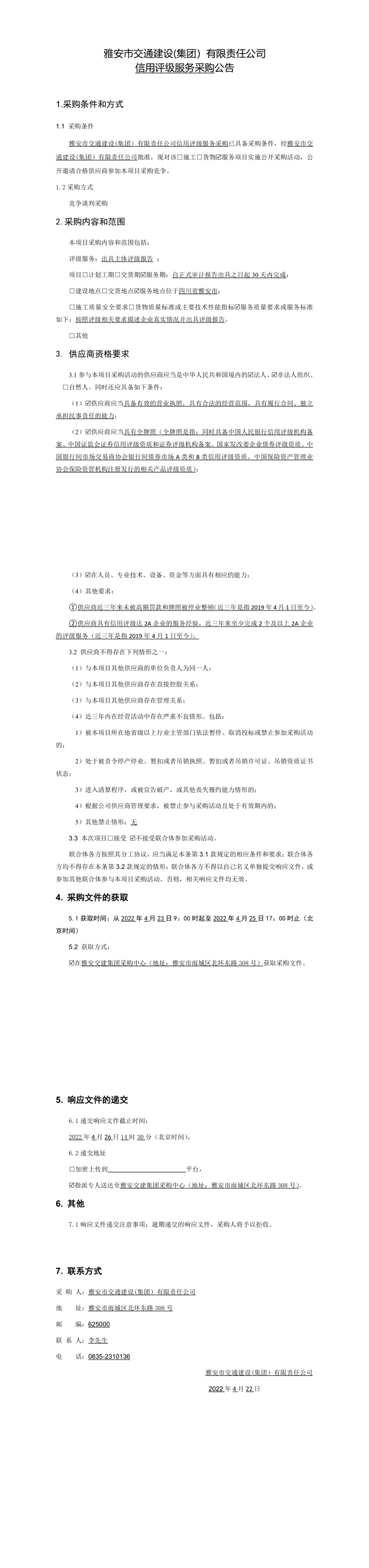 雅安市交通建設(shè)(集團)有限責(zé)任公司信用評級服務(wù)采購公告