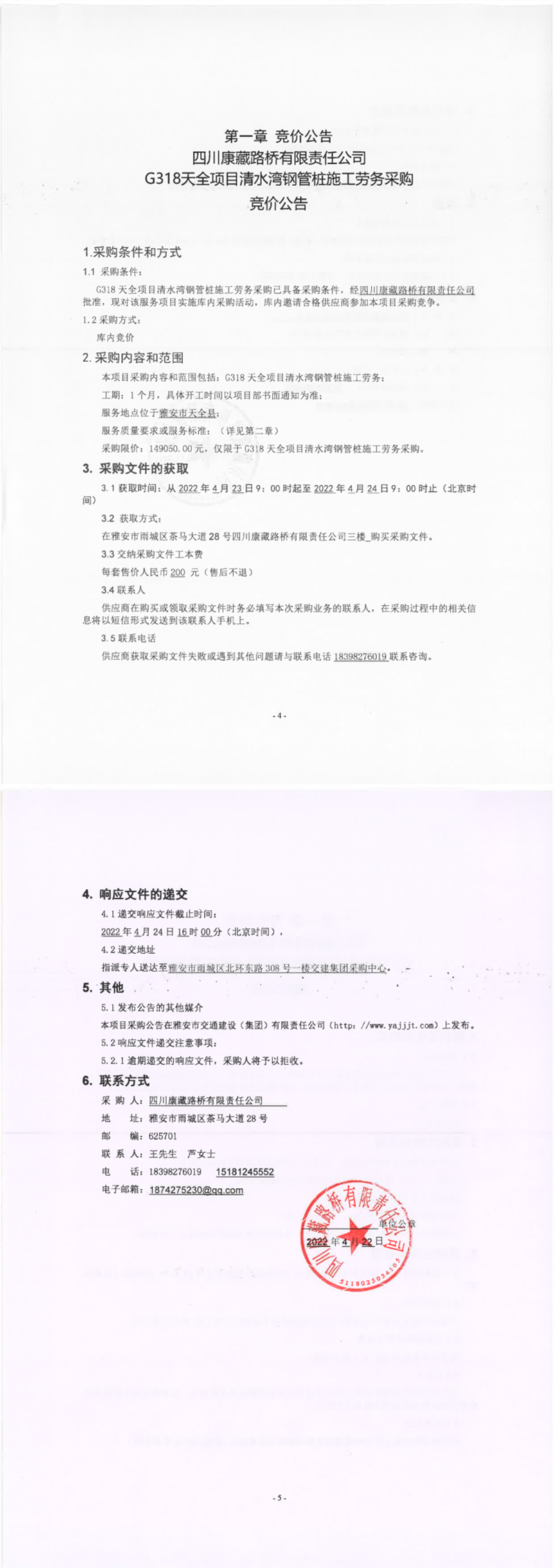 四川康藏路橋有限責(zé)任公司G318天全項(xiàng)目清水灣鋼管樁施工勞務(wù)采購競(jìng)價(jià)公告