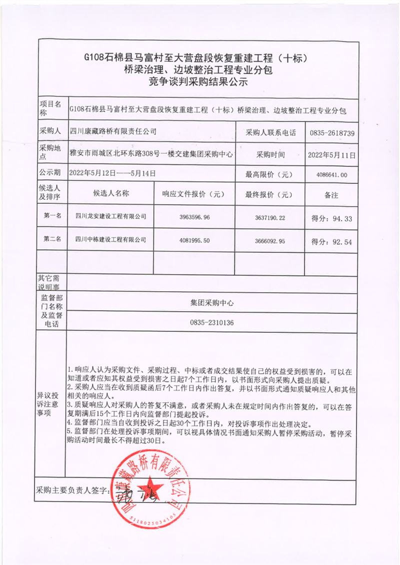 四川康藏路橋有限責(zé)任公司G108線石棉縣馬富村至大營(yíng)盤(pán)段恢復(fù)重建工程(十標(biāo))橋梁治理、邊坡整治工程專業(yè)分包競(jìng)爭(zhēng)談判采購(gòu)結(jié)果公示