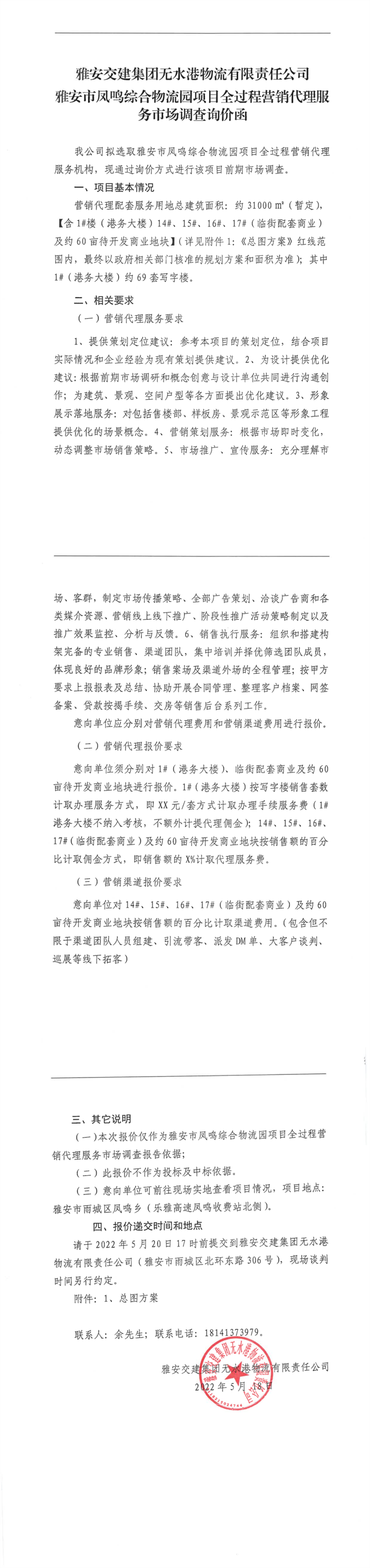 雅安交建集團無水港物流有限責任公司雅安市鳳鳴綜合物流園項目全過程營銷代理服務市場調查詢價函