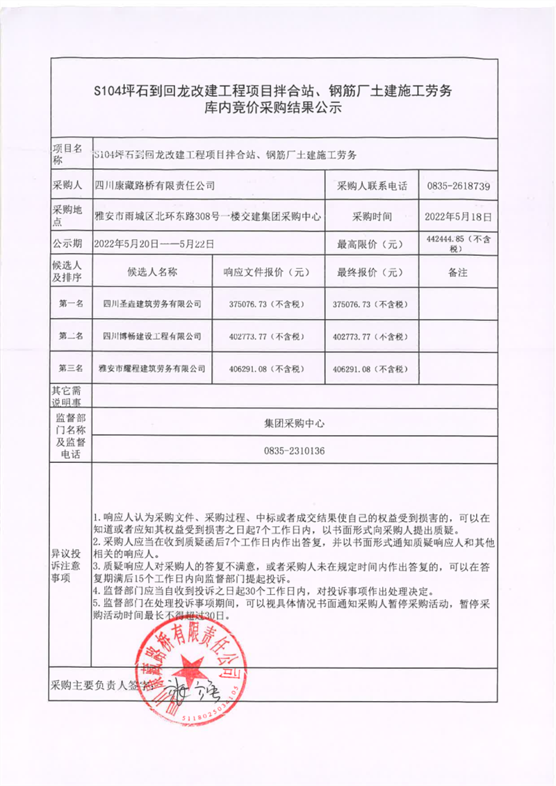 四川康藏路橋有限責任公司S104坪石到回龍改建工程項目拌合站、鋼筋廠土建施工勞務庫內(nèi)競價采購結(jié)果公示