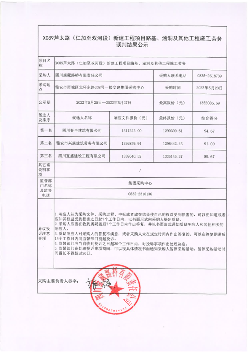 四川康藏路橋有限責任公司X089蘆太路(仁加至雙河段)新建工程項目路基、涵洞及其他工程施工勞務談判結果公示