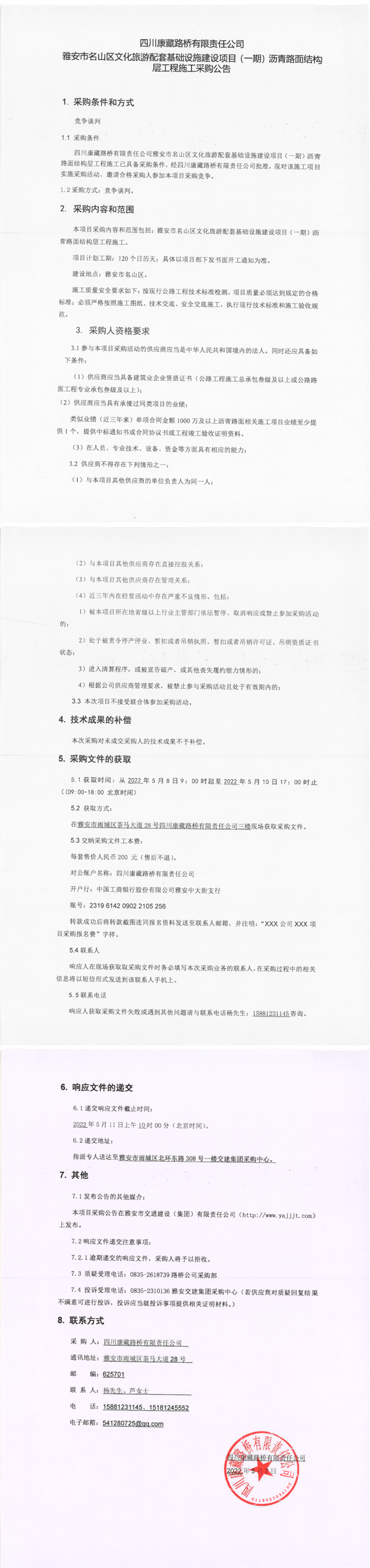 四川康藏路橋有限責(zé)任公司雅安市名山區(qū)文化旅游配套基礎(chǔ)設(shè)施建設(shè)項目(一期)瀝青路面結(jié)構(gòu)層工程施工采購公告
