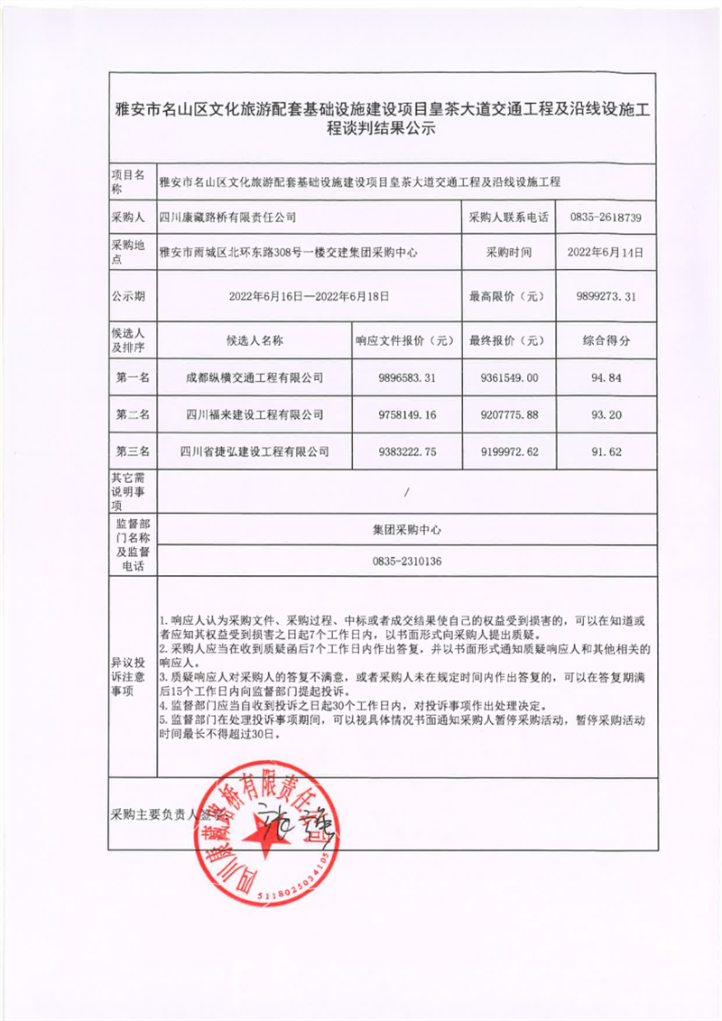 四川康藏路橋有限責任公司雅安市名山區(qū)文化旅游配套基礎(chǔ)設(shè)施建設(shè)項目皇茶大道交通工程及沿線設(shè)施工程談判結(jié)果公示
