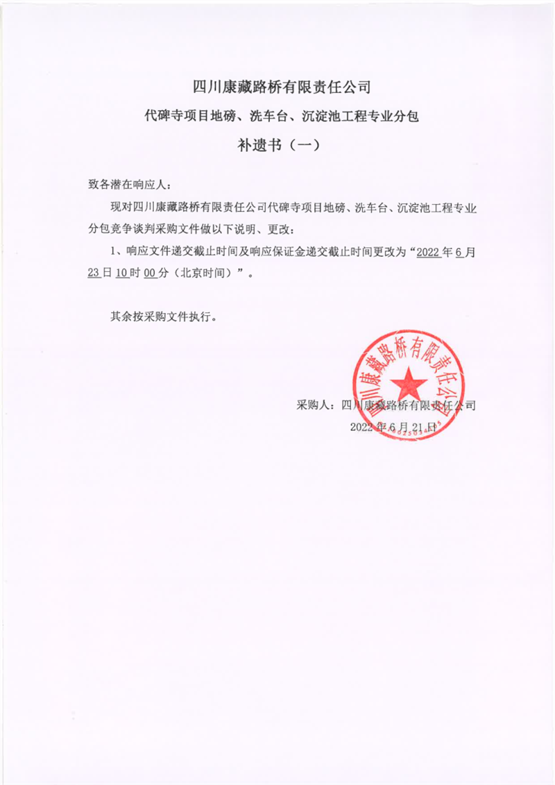 四川康藏路橋有限責(zé)任公司代碑寺項目地磅、洗車臺、沉淀池工程專業(yè)分包補遺書(一)