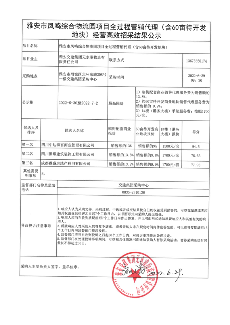 雅安交建集團(tuán)無(wú)水港物流有限責(zé)任公司雅安市鳳鳴綜合物流園項(xiàng)目全過(guò)程營(yíng)銷代理(含60畝待開(kāi)發(fā)地塊)經(jīng)營(yíng)高效招采結(jié)果公示