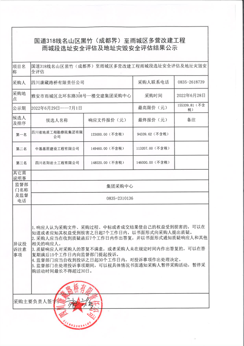 四川康藏路橋有限責任公司國道318名山區(qū)黑竹(成都界)至雨城區(qū)多營段改建工程雨城段選址安全評估及地址災(zāi)毀安全評估結(jié)果公示