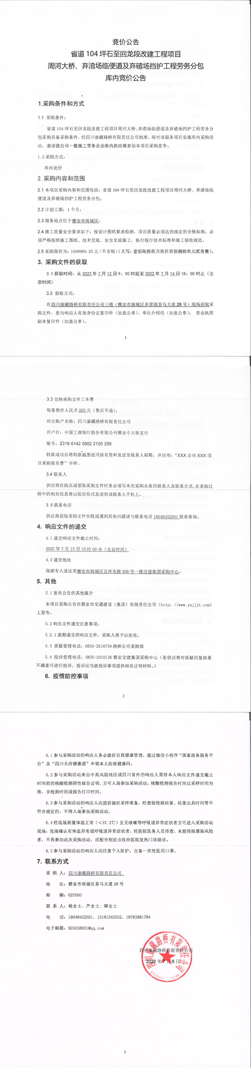 四川康藏路橋有限責(zé)任公司省道104坪石至回龍段改建工程項(xiàng)目周河大橋、棄渣場(chǎng)臨便道及棄碴場(chǎng)擋護(hù)工程勞務(wù)分包庫(kù)內(nèi)競(jìng)價(jià)公告