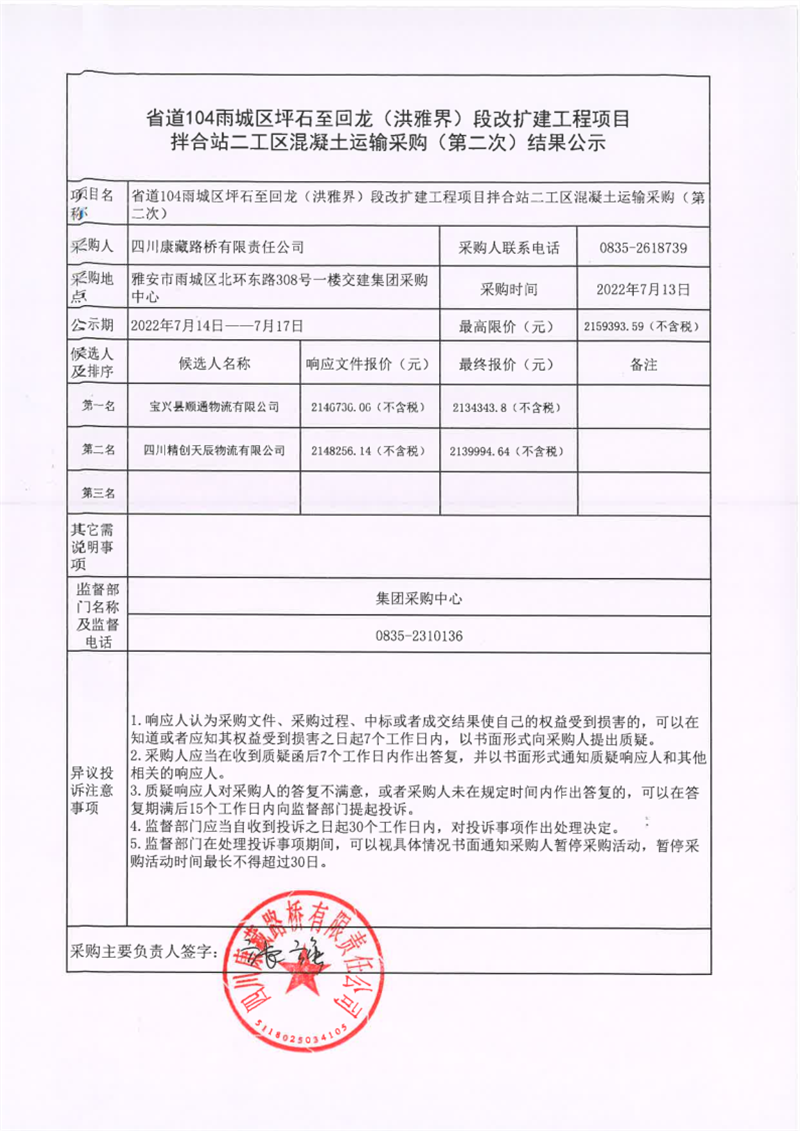 四川康藏路橋有限責(zé)任公司省道104線雨城區(qū)坪石至回龍(洪雅界)段改擴(kuò)建工程項目拌合站二工區(qū)混凝土運(yùn)輸采購(第二次)結(jié)果公示