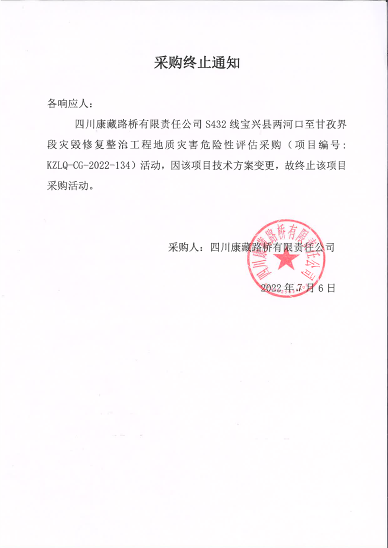 四川康藏路橋有限責(zé)任公司S432線寶興縣兩河口至甘孜界段災(zāi)毀修復(fù)整治工程地質(zhì)災(zāi)害危險性評估采購終止通知
