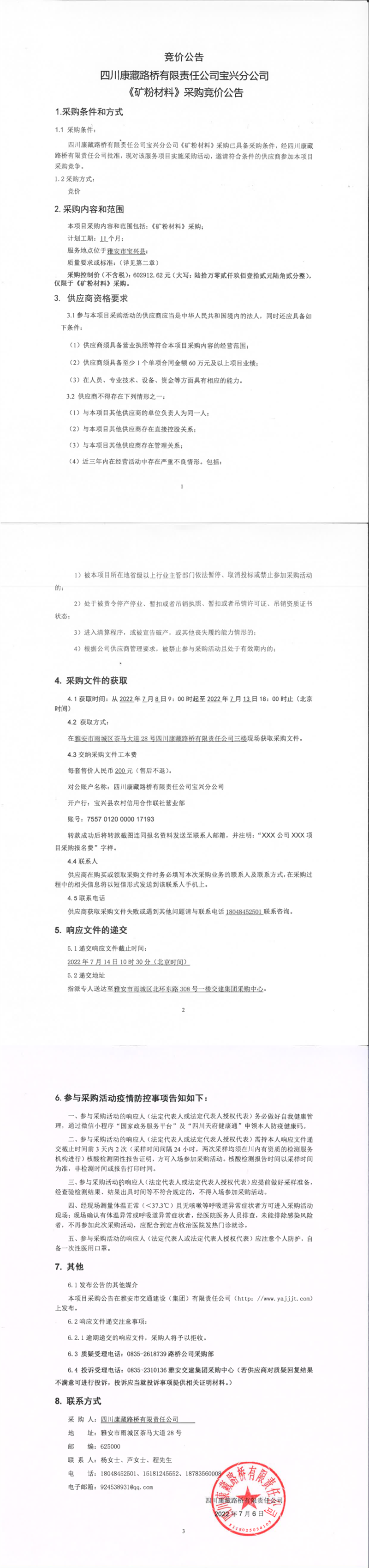 四川康藏路橋有限責(zé)任公司寶興分公司礦粉材料采購競(jìng)價(jià)公告
