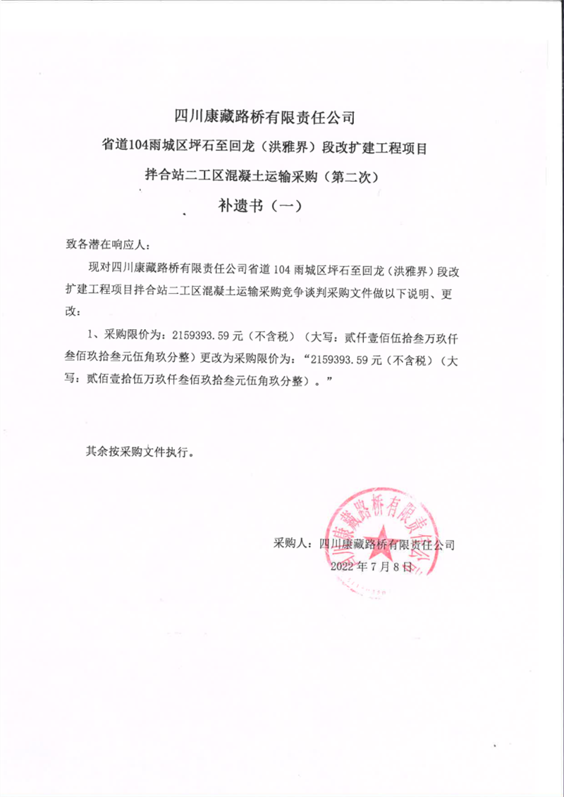 四川康藏路橋有限責(zé)任公司省道104線雨城區(qū)坪石至回龍(洪雅界)段改建工程項目拌合站二工區(qū)混凝土運輸采購(第二次)補遺書(一)