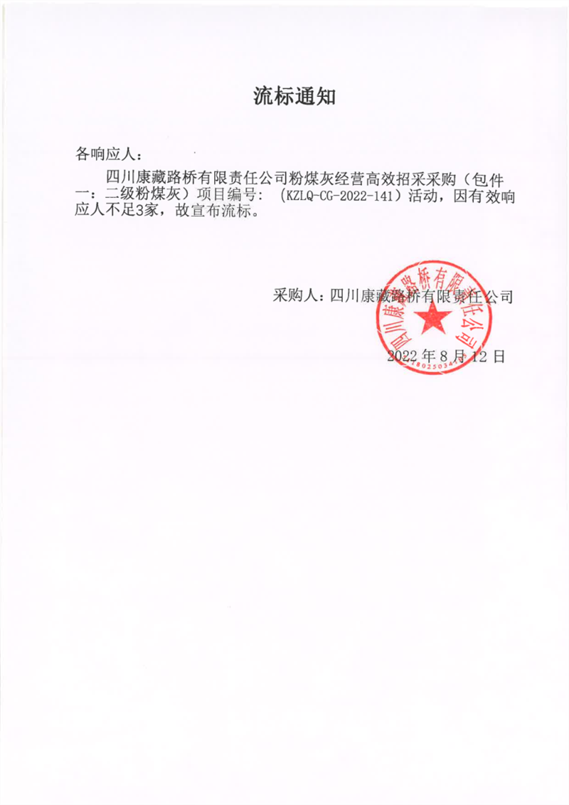 四川康藏路橋有限責(zé)任公司粉煤灰經(jīng)營(yíng)高效招采采購(包件一:二級(jí)粉煤灰)流標(biāo)通知