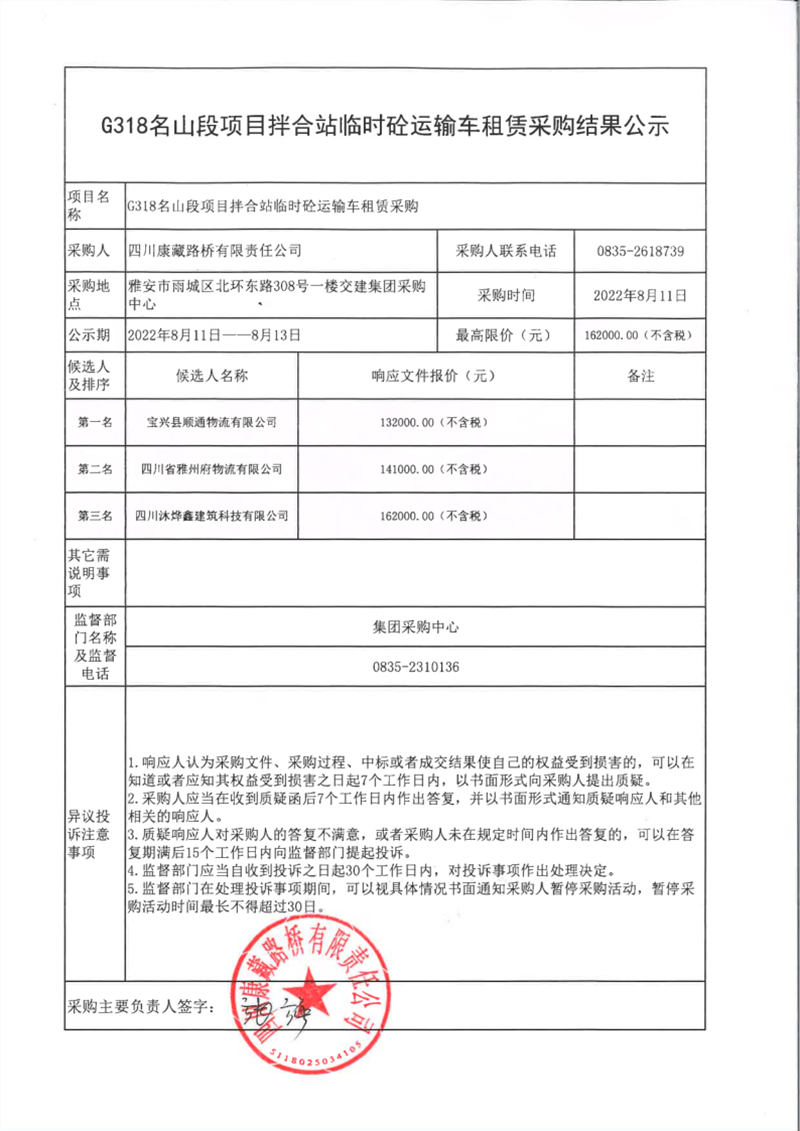 四川康藏路橋有限責(zé)任公司G318名山段項(xiàng)目拌合站臨時(shí)砼運(yùn)輸車(chē)租賃采購(gòu)結(jié)果公示