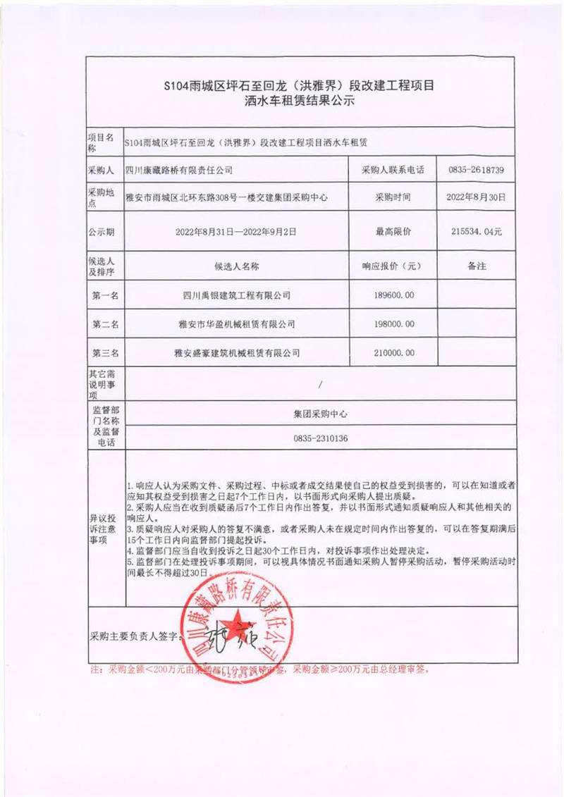 四川康藏路橋有限責任公司S104雨城區(qū)坪石至回龍(洪雅界)段改建工程項目灑水車租賃結(jié)果公示