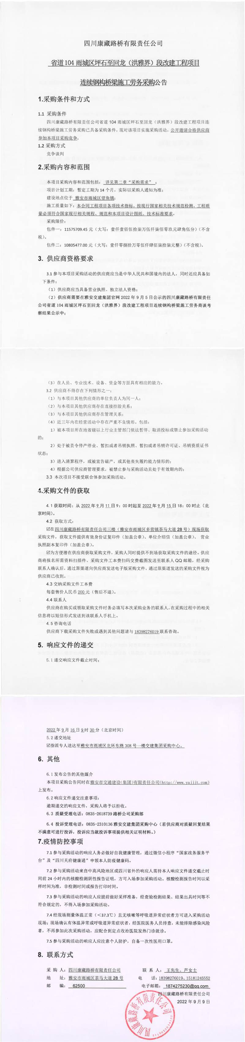 四川康藏路橋有限責任公司省道104雨城區(qū)坪石至回龍(洪雅界)段改建工程項目連續(xù)鋼構(gòu)橋梁施工勞務采購公告