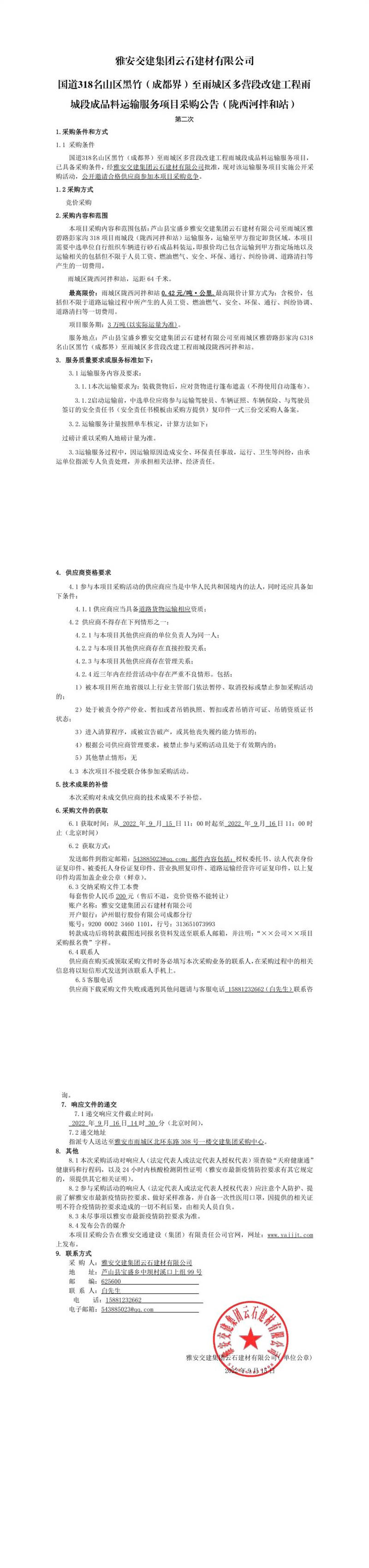 雅安交建集團(tuán)云石建材有限公司國道318名山區(qū)黑竹(成都界)至雨城區(qū)多營段改建工程名山段成品料運輸服務(wù)項目采購公告(皇茶大道拌和站)