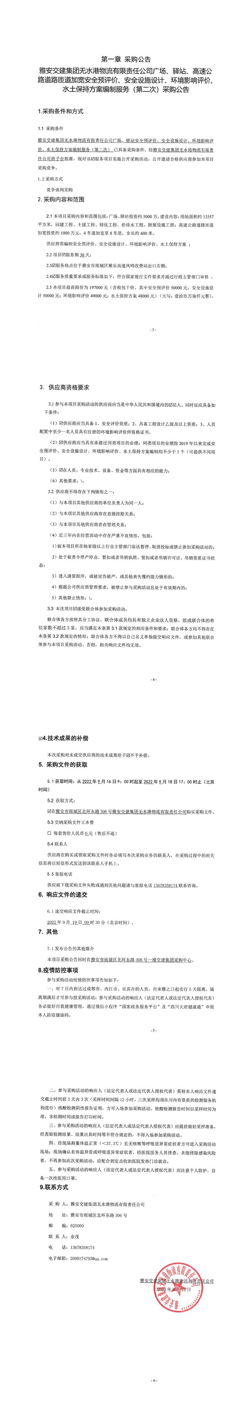 雅安交建集團無水港物流有限責任公司廣場、驛站、高速公路道路匝道加寬安全預評價、安全設施設計、環(huán)境影響評價、水土保持方案編制服務(第二次)采購公告