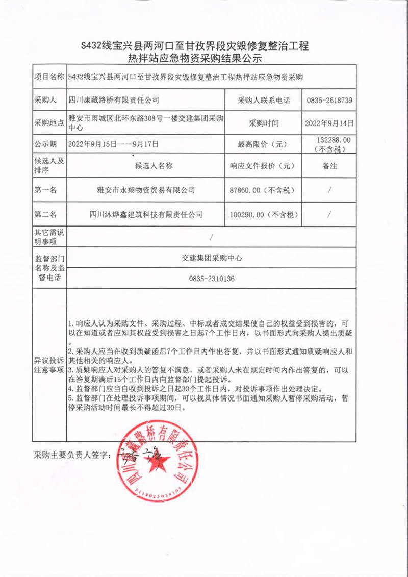 四川康藏路橋有限責任公司S432線寶興縣兩河口至甘孜界段災毀修復整治工程熱拌站應急物資采購結果公示