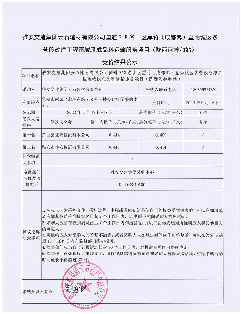 雅安交建集團(tuán)云石建材有限公司國道318名山區(qū)黑竹(成都界)至雨城區(qū)多營段改建工程雨城段成品料運(yùn)輸服務(wù)項(xiàng)目(皇茶大道拌和站)競(jìng)價(jià)結(jié)果公示