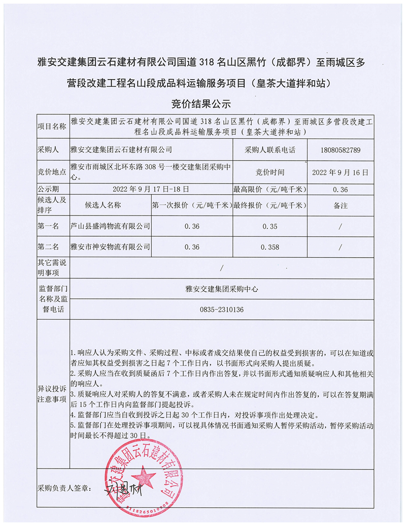 雅安交建集團云石建材有限公司國道318名山區(qū)黑竹(成都界)至雨城區(qū)多營段改建工程雨城段成品料運輸服務(wù)項目(皇茶大道拌和站)競價結(jié)果公示