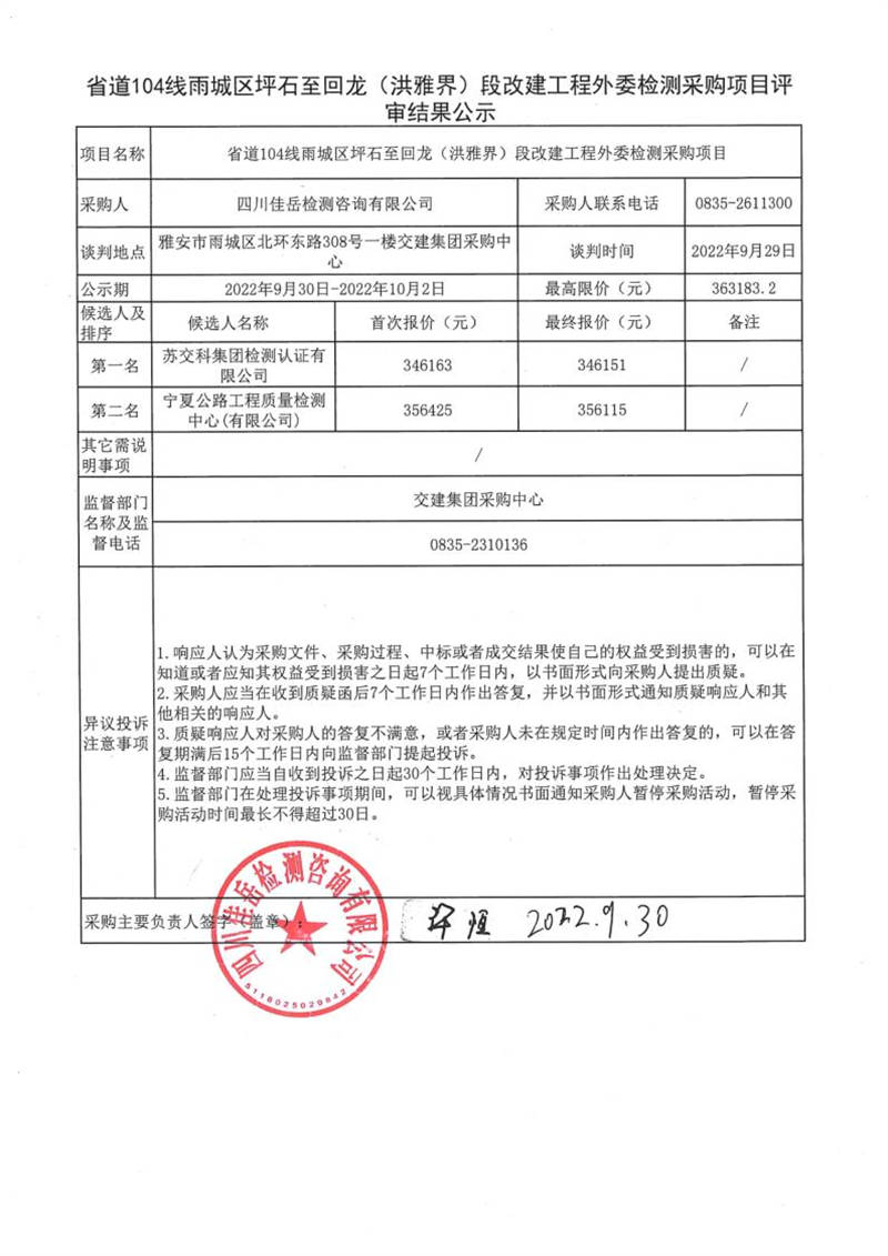 四川佳岳檢測咨詢有限公司省道104線雨城區(qū)坪石至回龍(洪雅界)段改建工程外委檢測采購項目評審結(jié)果公示