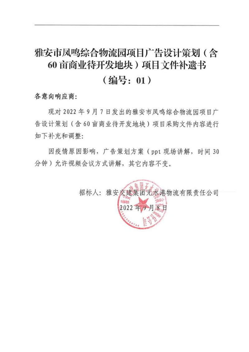 雅安交建集團(tuán)無水港物流有限責(zé)任公司雅安市鳳鳴綜合物流園項目廣告設(shè)計策劃(含60畝商業(yè)待開發(fā)地塊)項目文件補遺書(編號:01)