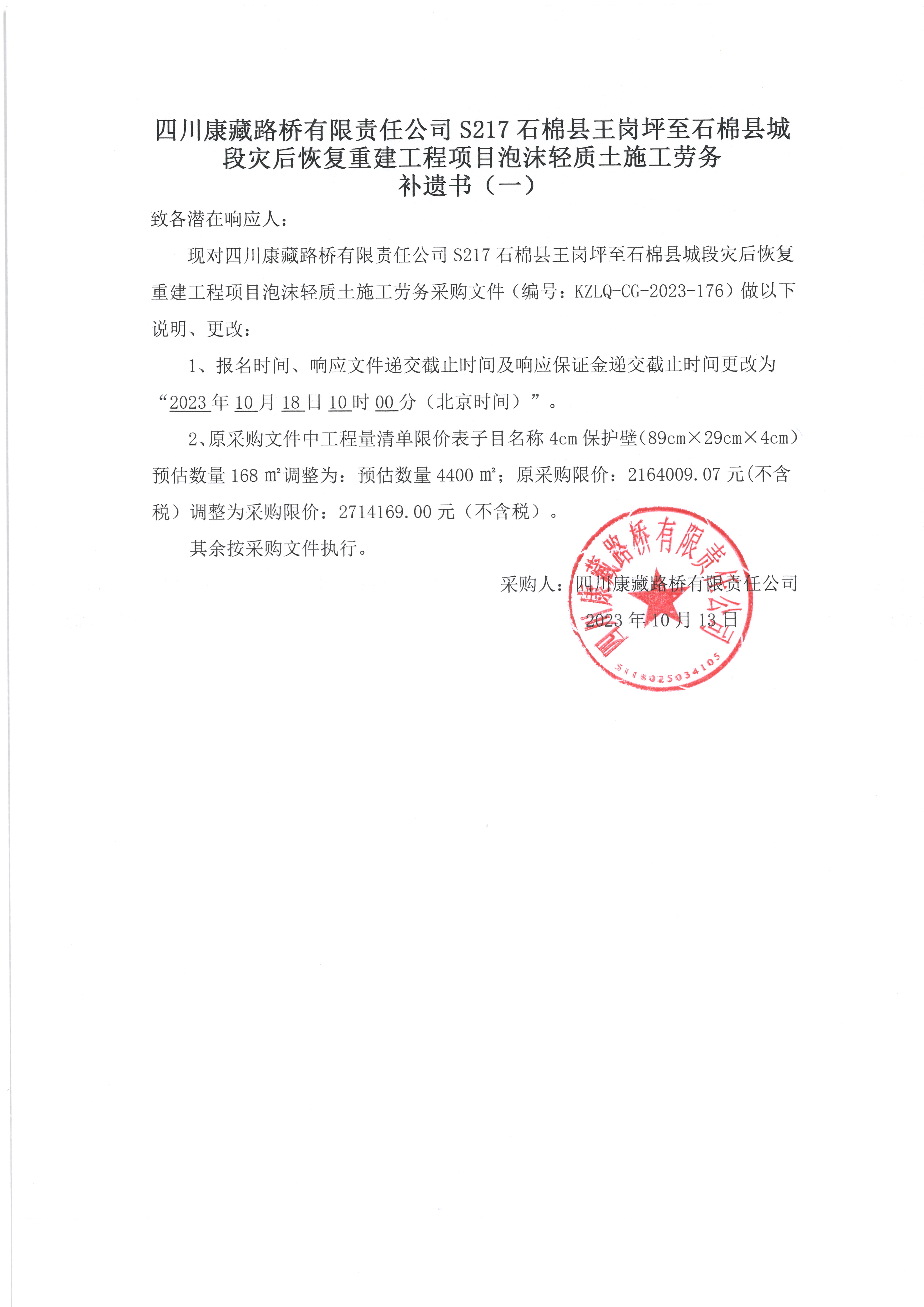 四川康藏路橋有限責(zé)任公司S217石棉縣王崗坪至石棉縣城段災(zāi)后恢復(fù)重建工程項目泡沫輕質(zhì)土施工勞務(wù)補遺書(一)