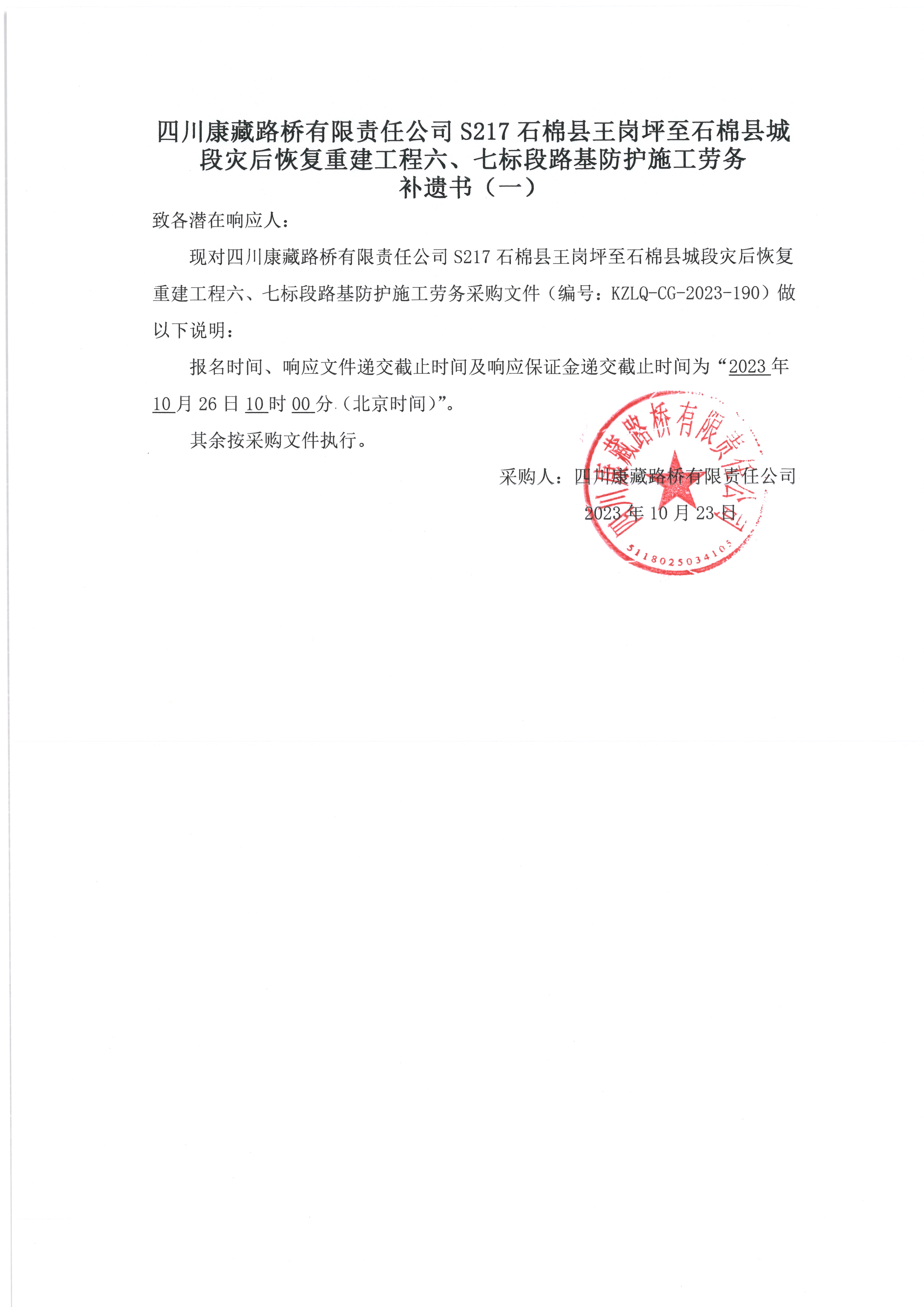 四川康藏路橋有限責(zé)任公司S217石棉縣王崗坪至石棉縣城段災(zāi)后恢復(fù)重建工程六、七標(biāo)段路基防護(hù)施工勞務(wù) 補遺書(一)