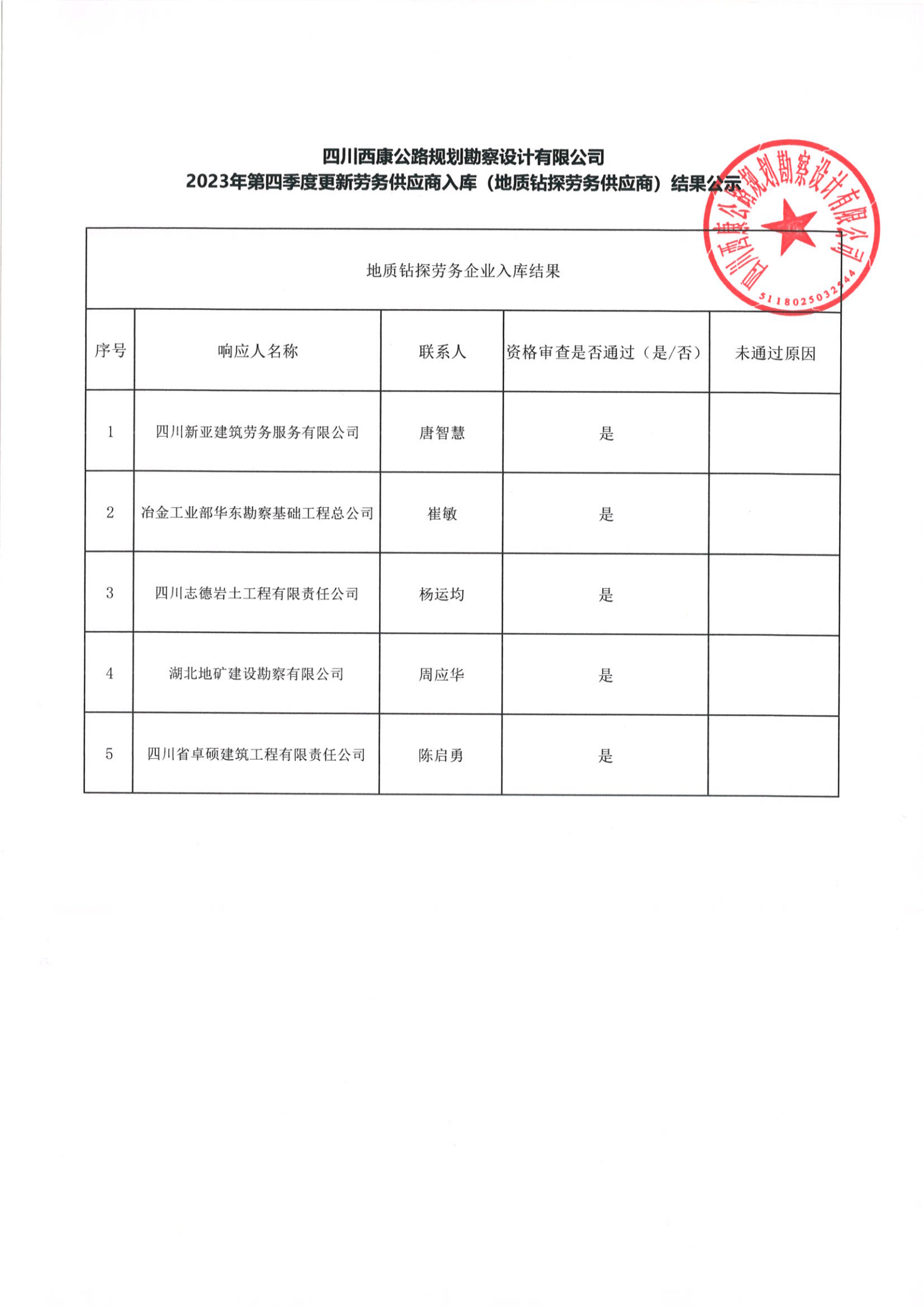 四川西康公路規(guī)劃勘察設(shè)計有限公司2023年第四季度更新勞務供應商入庫(地質(zhì)鉆探勞務供應商)結(jié)果公示