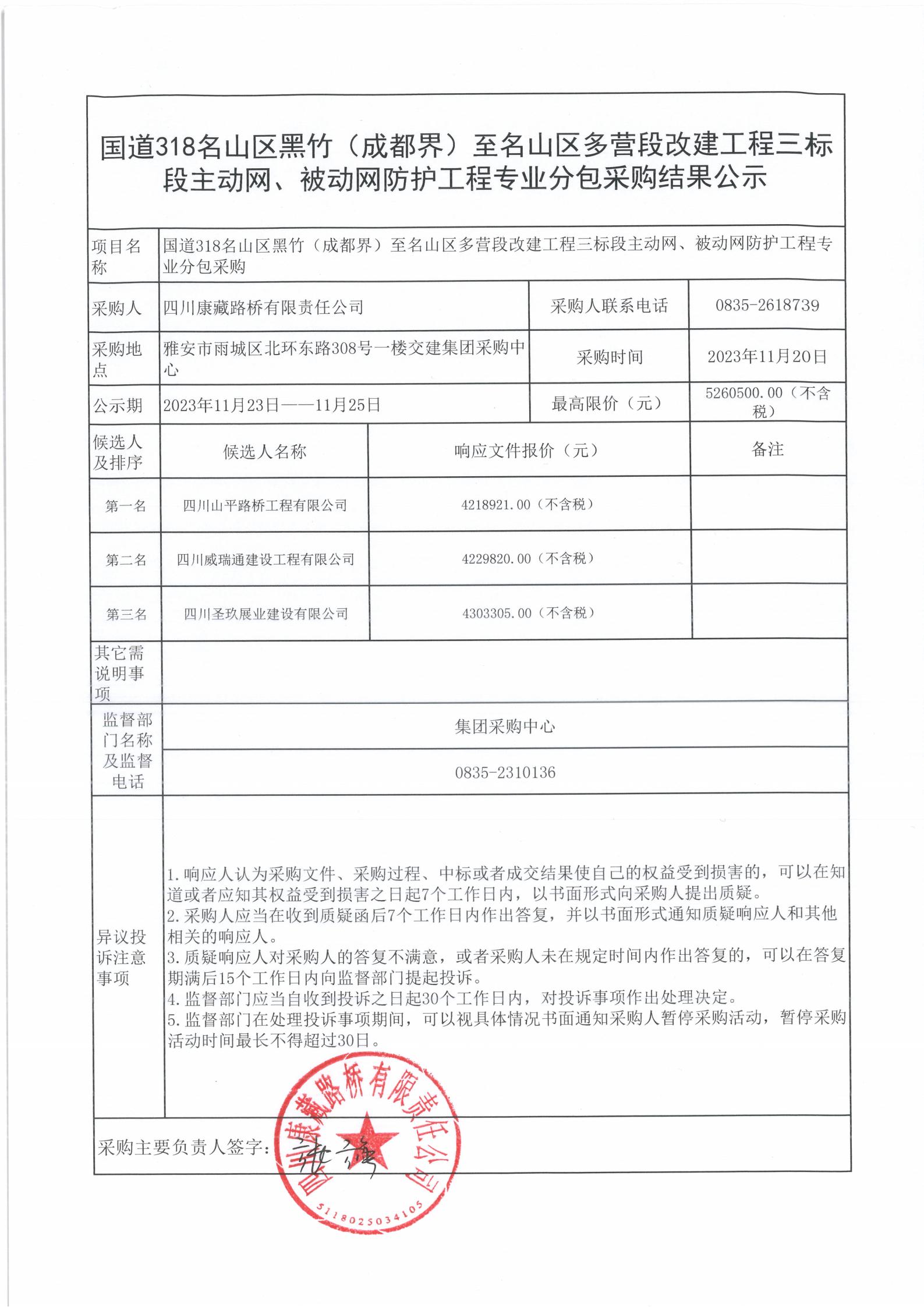 四川康藏路橋有限責(zé)任公司國道318名山區(qū)黑竹(成都界)至名山區(qū)多營段改建工程三標(biāo)段主動網(wǎng)、被動網(wǎng)防護工程專業(yè)分包采購結(jié)果公示