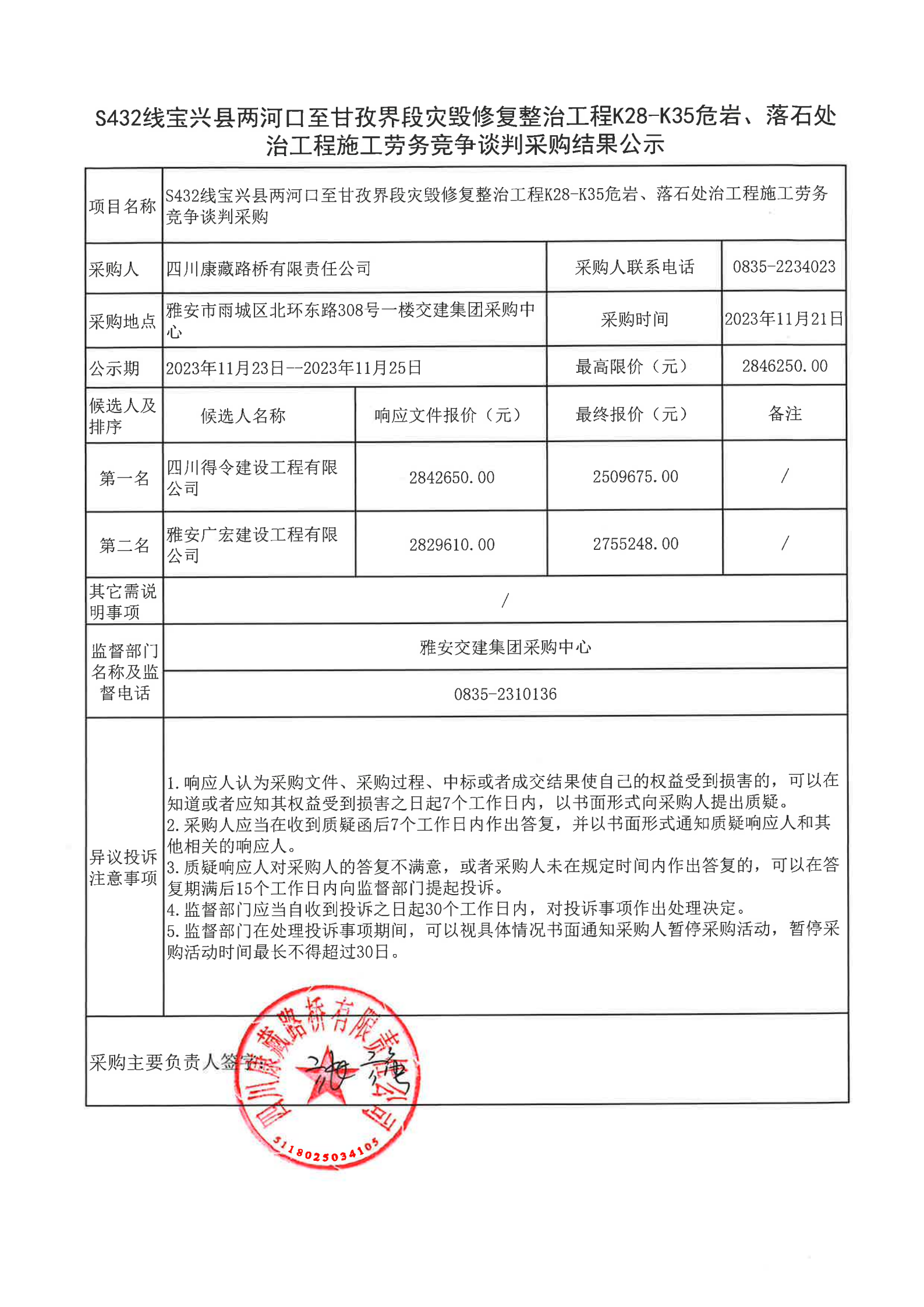 四川康藏路橋有限責(zé)任公司S432線(xiàn)寶興縣兩河口至甘孜界段災(zāi)毀修復(fù)整治工程K28-K35危巖、落石處治工程施工勞務(wù)競(jìng)爭(zhēng)談判采購(gòu)結(jié)果公示