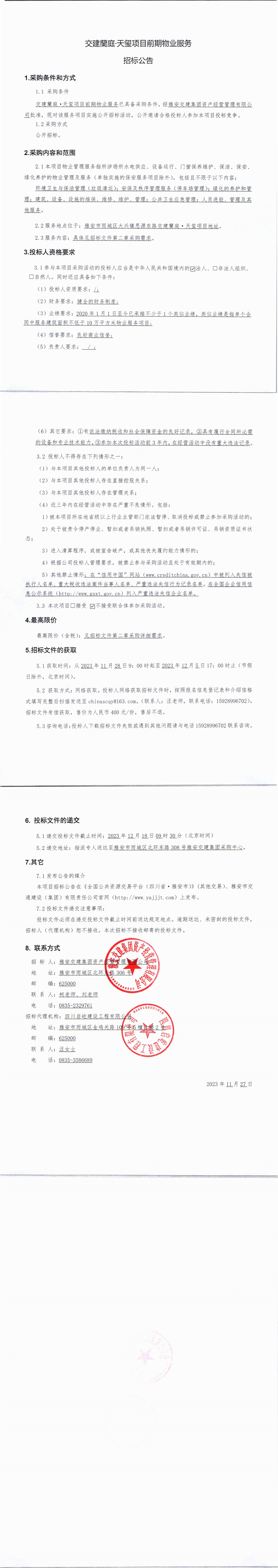 雅安交建集團資產(chǎn)經(jīng)營管理有限公司交建蘭庭·天璽項目前期物業(yè)服務(wù)招標公告