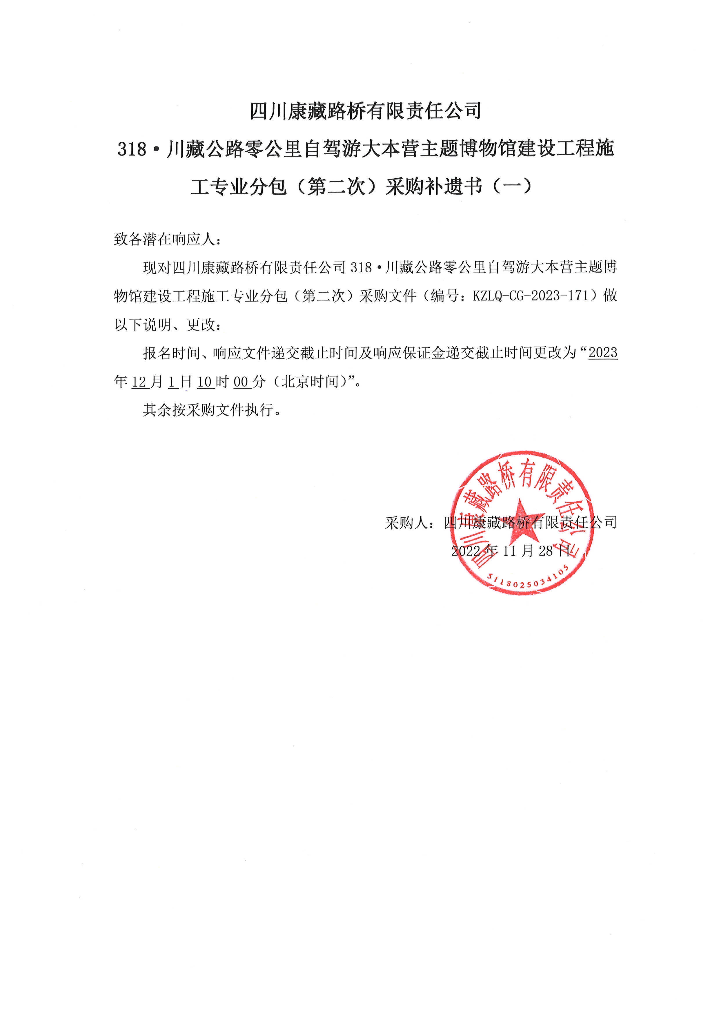 四川康藏路橋有限責(zé)任公司318·川藏公路零公里自駕游大本營主題博物館建設(shè)工程施工專業(yè)分包(第二次)采購補(bǔ)遺書(一)