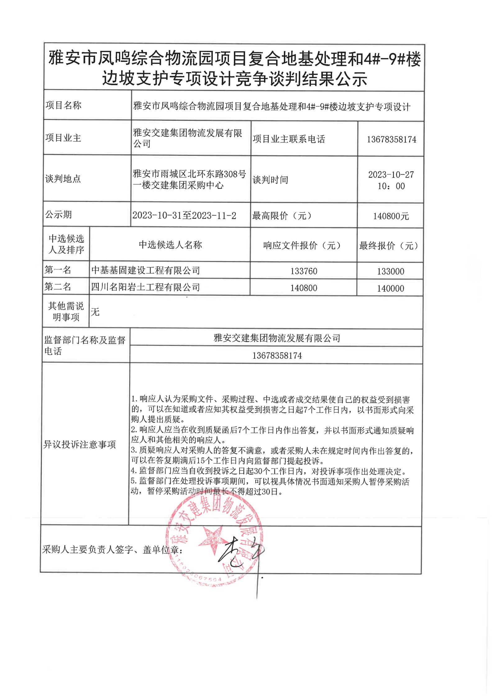 雅安交建集團(tuán)物流發(fā)展有限公司雅安市鳳鳴綜合物流園項(xiàng)目復(fù)合地基處理和4#-9#樓邊坡支護(hù)專項(xiàng)設(shè)計(jì)競(jìng)爭(zhēng)談判結(jié)果公示