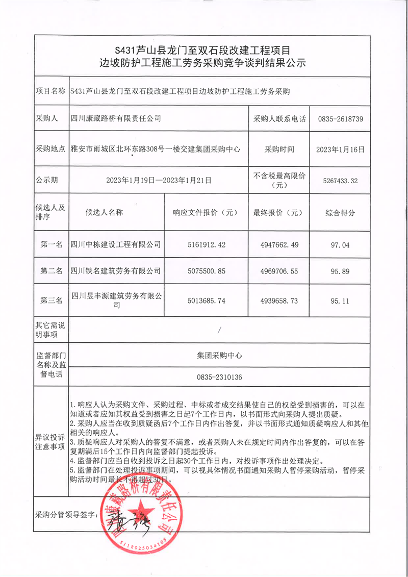 四川康藏路橋有限責任公司S431蘆山縣龍門至雙石段改建工程項目邊坡防護工程施工勞務采購競爭談判結(jié)果公示
