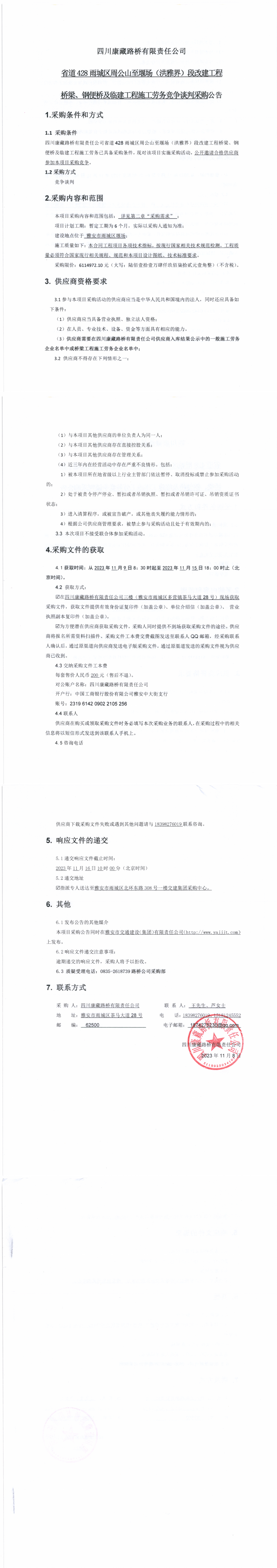 四川康藏路橋有限責(zé)任公司省道428雨城區(qū)周公山至堰場(洪雅界)段改建工程橋梁、鋼便橋及臨建工程施工勞務(wù)采購公告