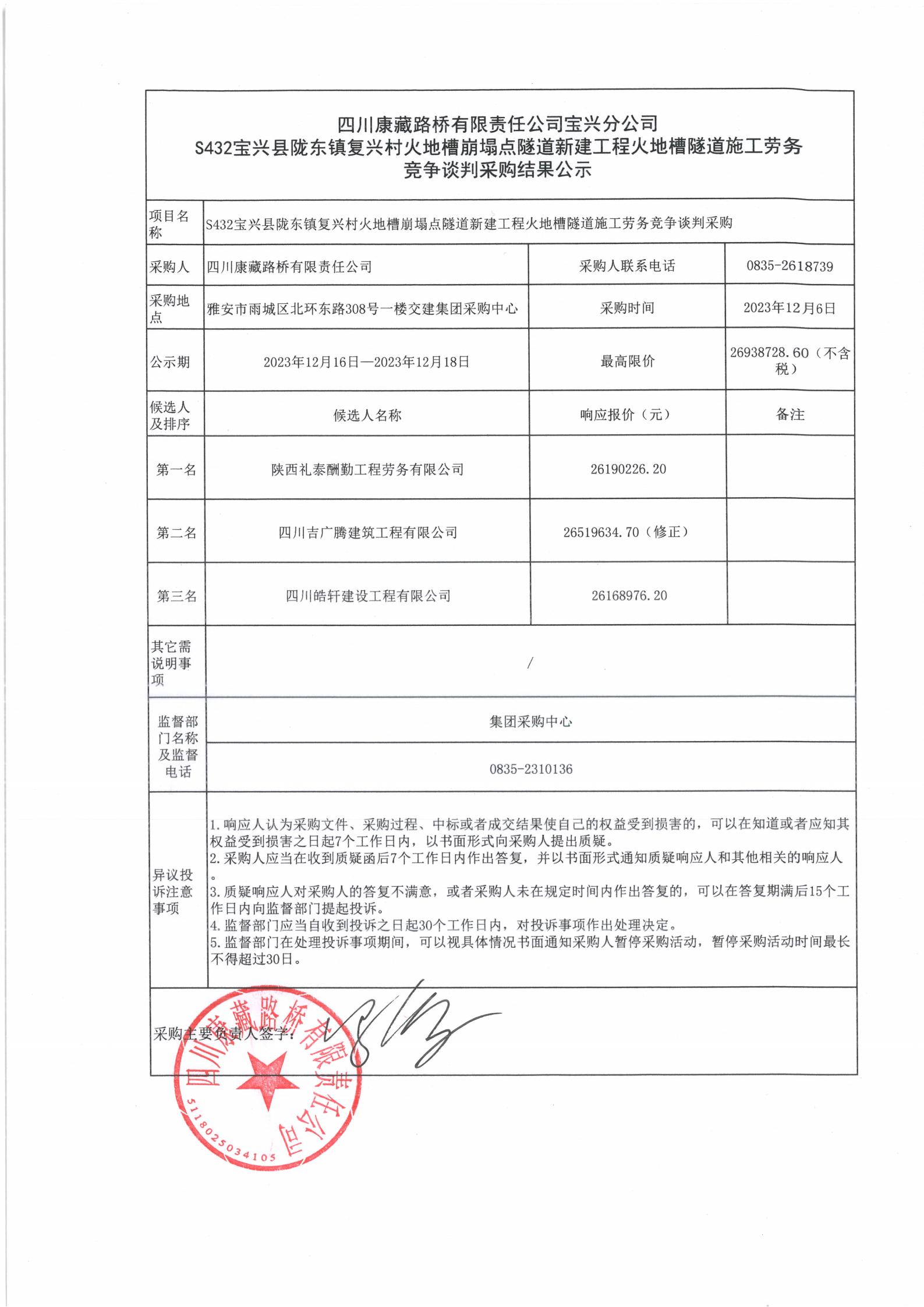 四川康藏路橋有限責任公司寶興分公司S432寶興縣隴東鎮(zhèn)復興村火地槽崩塌點隧道新建工程火地槽隧道施工勞務競爭談判采購結(jié)果公示